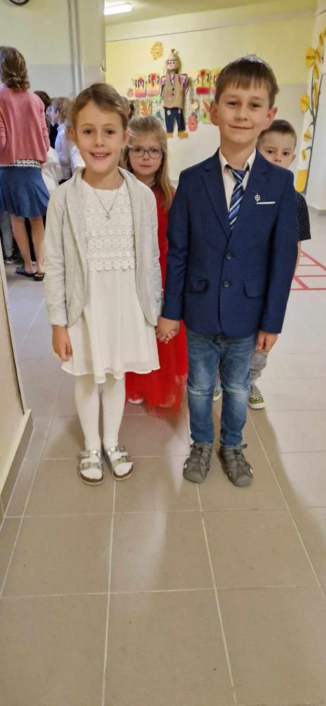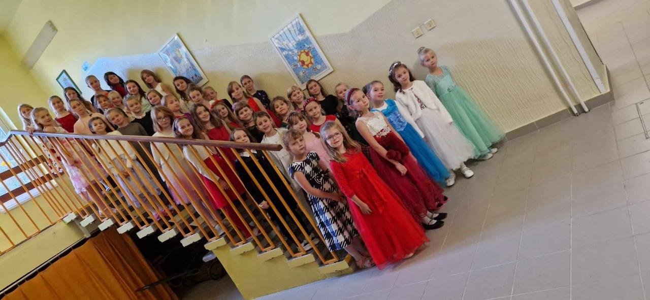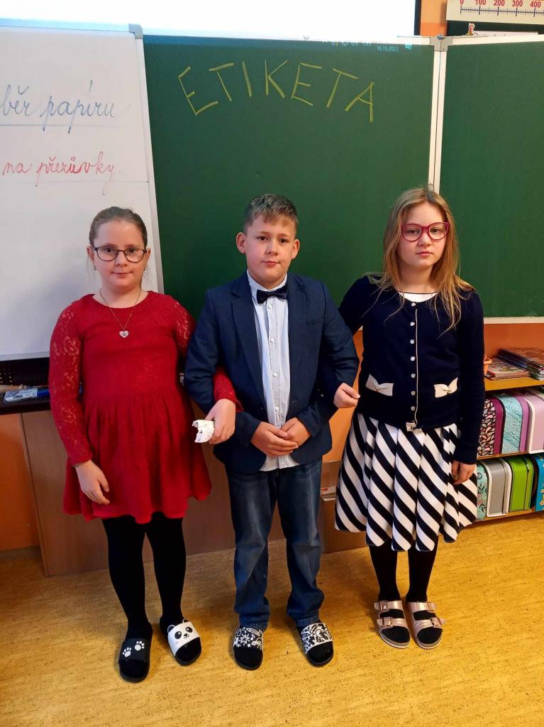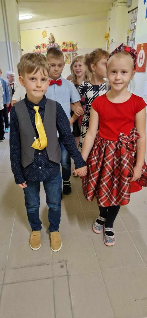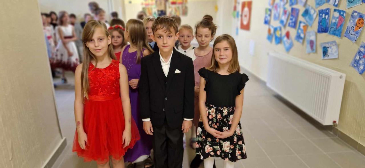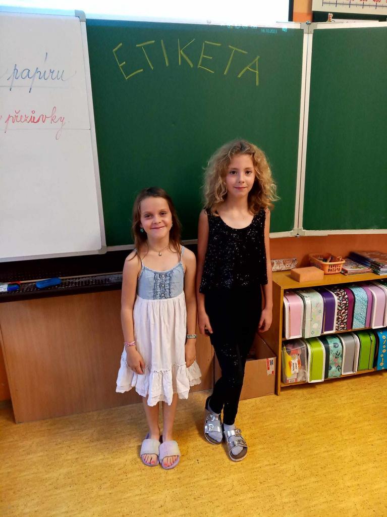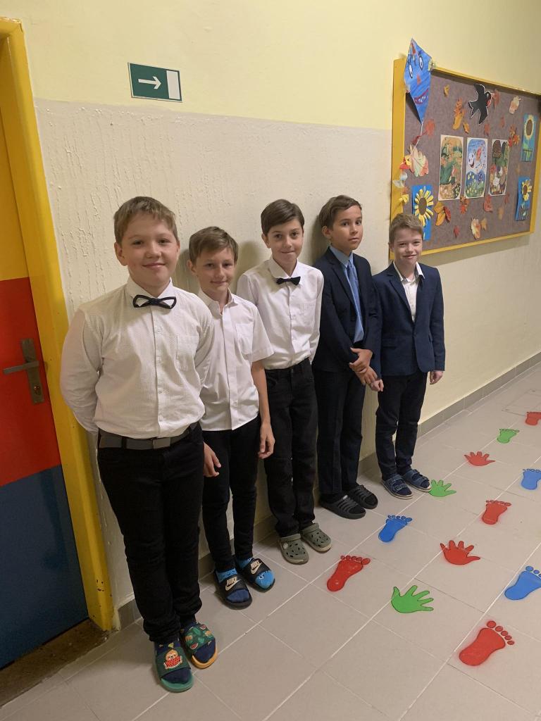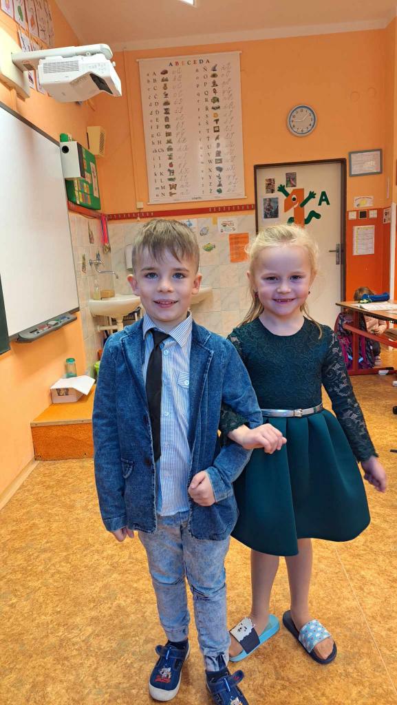 Dnes jsme šli do školy ve slavnostním a moc se nám to líbilo. Košile, kalhoty, motýlek, kravata, šaty, halenka, sukně - to z nás udělalo „pravé galány a nóbl dámy, slečny".