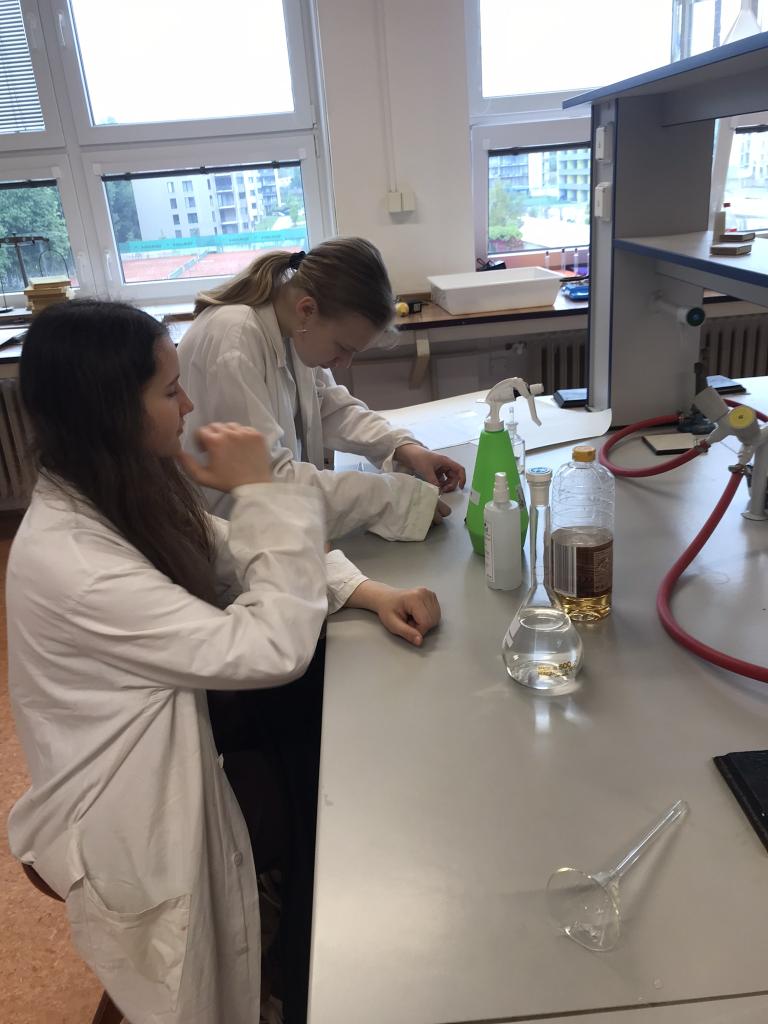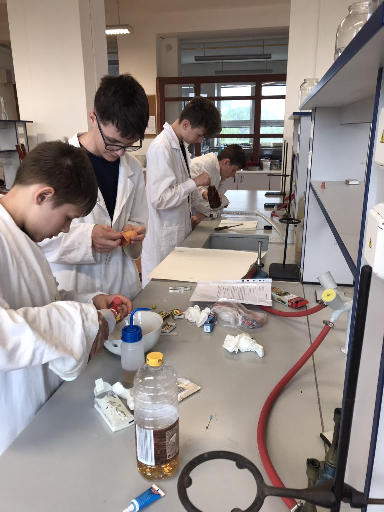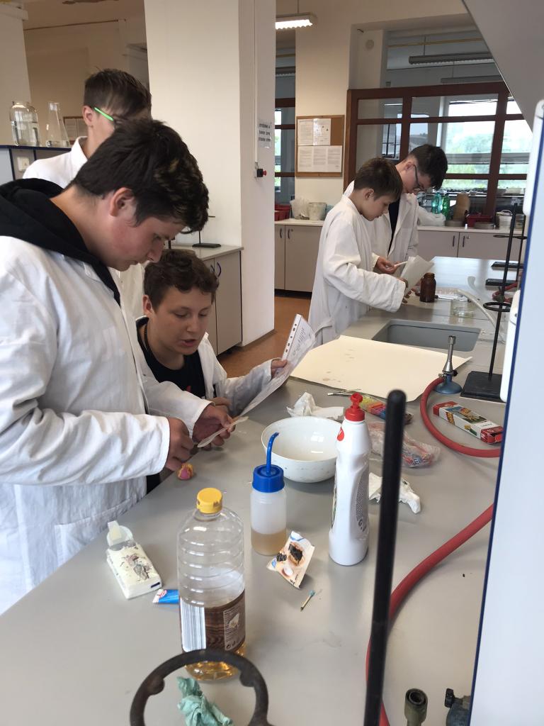 Žáci 8.A si v úterý 7.5.2024 vyzkoušeli v chemické laboratoři čtyři jednoduché chemické reakce. Pracovali podle předem připraveného návodu. Práce v laboratoři je bavila dařila se jim.