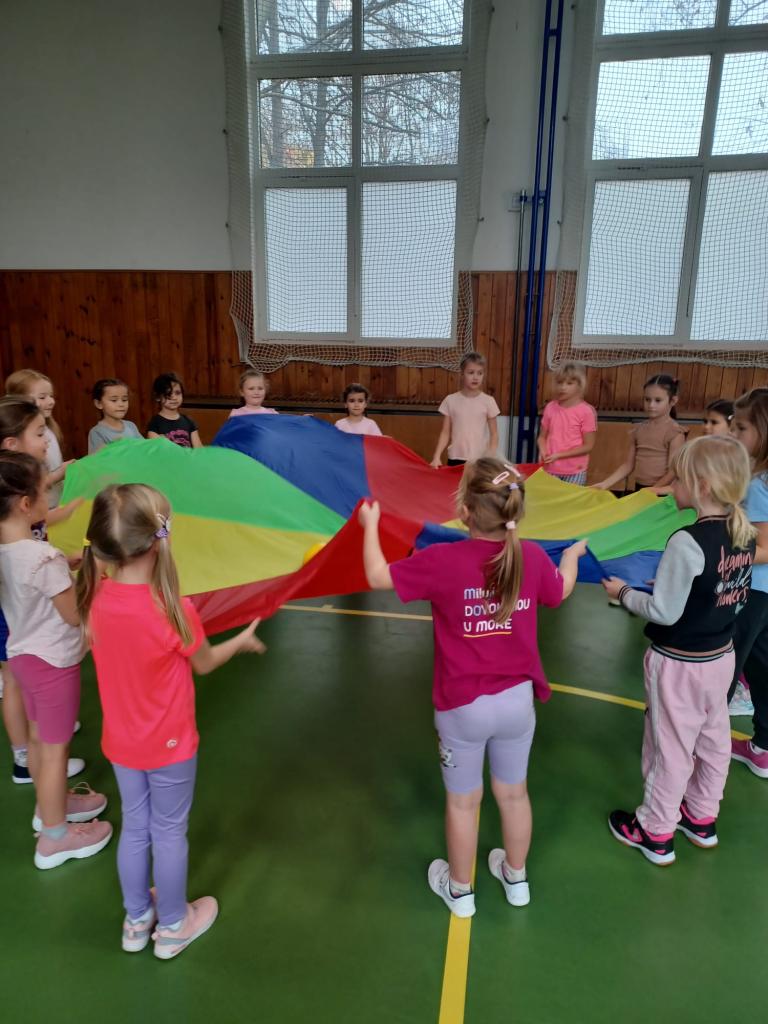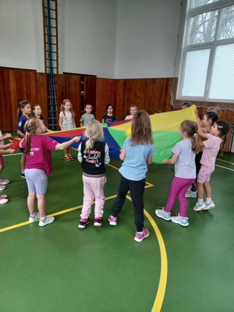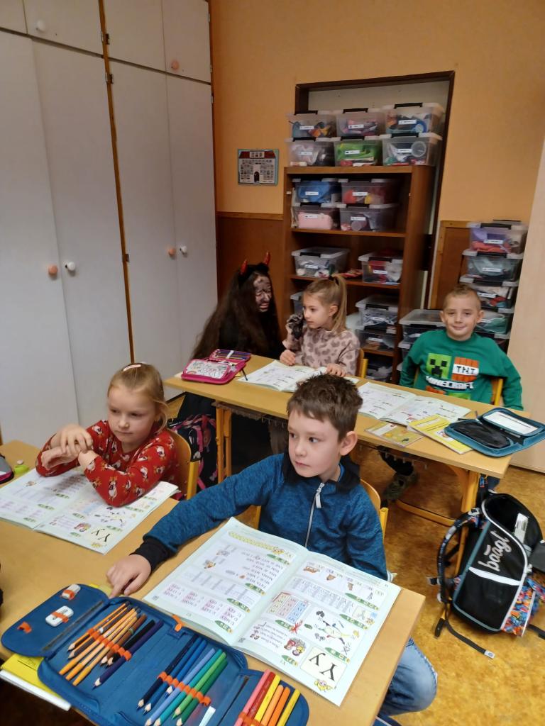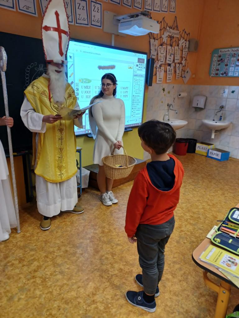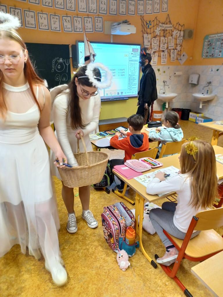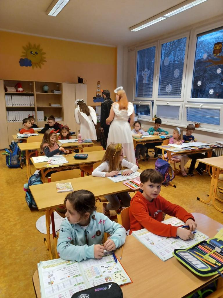 Při hře "Zvěřinec" a cvičení s padáky byla legrace. Když přišel do třídy Mikuláš se svým doprovodem všichni zvážněli. Písničku pro Mikuláše děti zpívaly z plných plic.